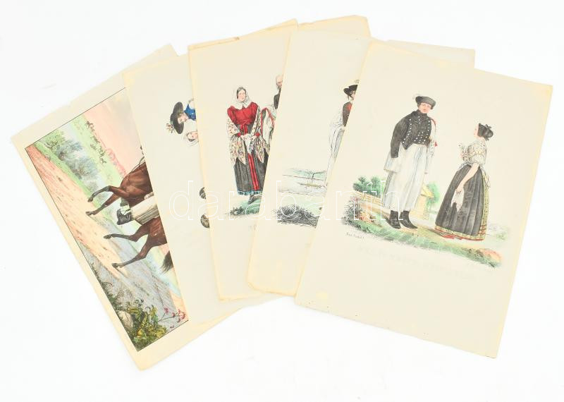 Magyar népviseletek 5 db színezett fametszetű nyomat XIX. sz. második fele Lapméret 20x30 cm