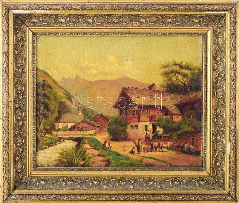 Lotz (?) jelzéssel: Jelenet. Olaj, vászon, sérült. Dekoratív, sérült fakeretben, 28×34,5 cm