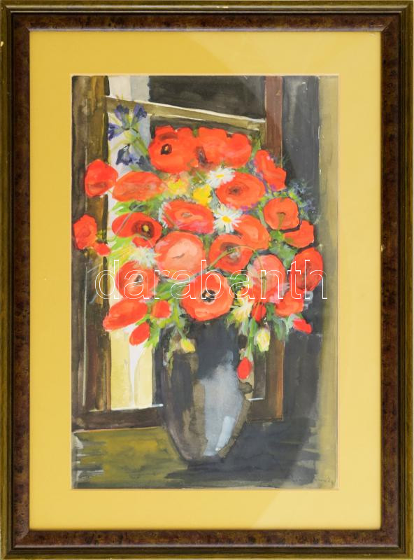 Tarnói Veronika: Pipacsos csendélet. Akvarell, papír, keretben, rajta kis sérülésekkel 38x25 cm