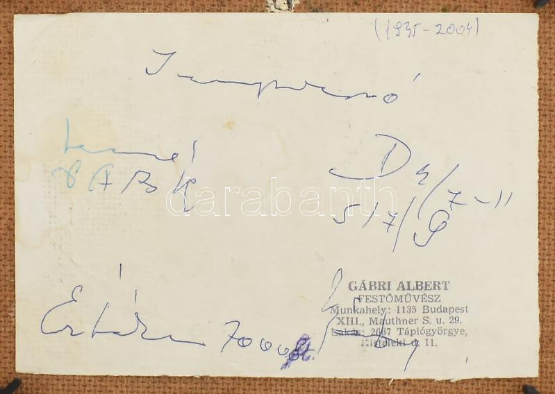 Gábri/Gábry Albert (1935-2004): Impresszió. Olaj, farost, jelezve balr... https://www.darabanth.com/en/475-Online-auction/475.0/Paintings-and-graphics/Paintings-and-graphics~500002/GabriGabry-Albert-1935-2004-Impresszio-Olaj-farost-jelezve-balra-lent-hatoldalan-a-muv~II3224551
