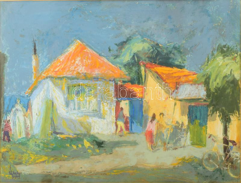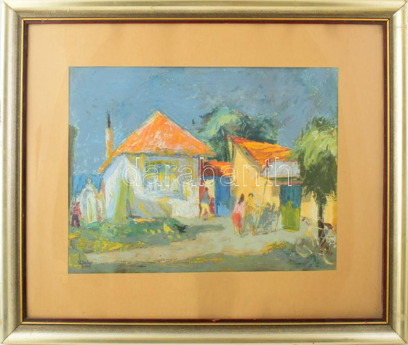 Újhelyi Gábor (1925-2005): Kutyasétáltatás, 1958. Olaj, karton, jelezv...