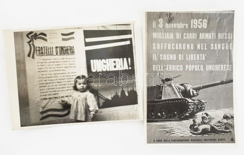 1956-1957 Olaszországban megjelent, az 1956-os magyar forradalommal kapcsolatos plakátólról készült fotók, 2 db, hátoldalon feliratozva, 12×8 cm