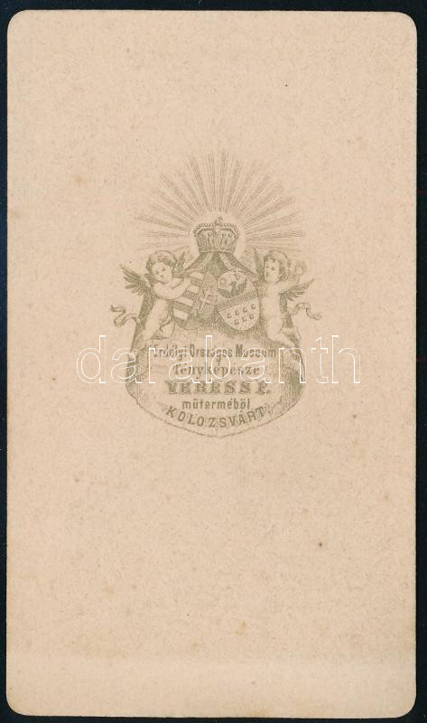 cca 1860-65 Fiatal hölgy görög jelmezben, feltehetően színésznő portréja, keményhátú fotó Veress Ferenc kolozsvári műterméből, 10,5x6 cm
