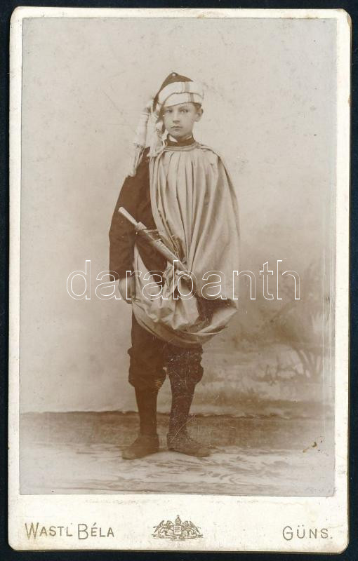 cca 1880 Fiatal fiú közel-keleti öltözetben, oldalán tőrrel, vizitkártya Wastl Béla kőszegi (német nevén: Güns) műterméből, 10x6,5 cm (Ritka műterem!)
