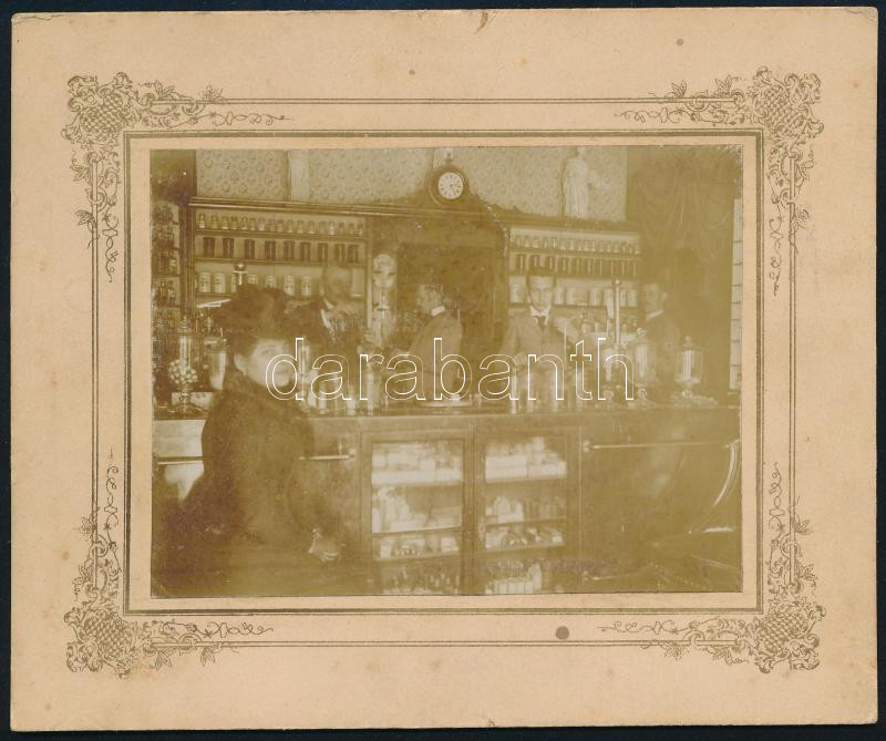 cca 1910 Ügyfél a patikában, kartonra kasírozott fotó, 8,5×11 cm