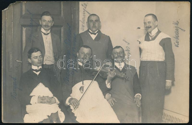 cca 1930 A Rahó zenekar tagjai, fotó képeslapon, kis sérüléssel 8,9x13,8 cm