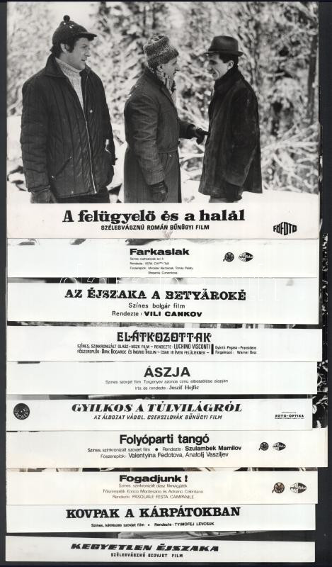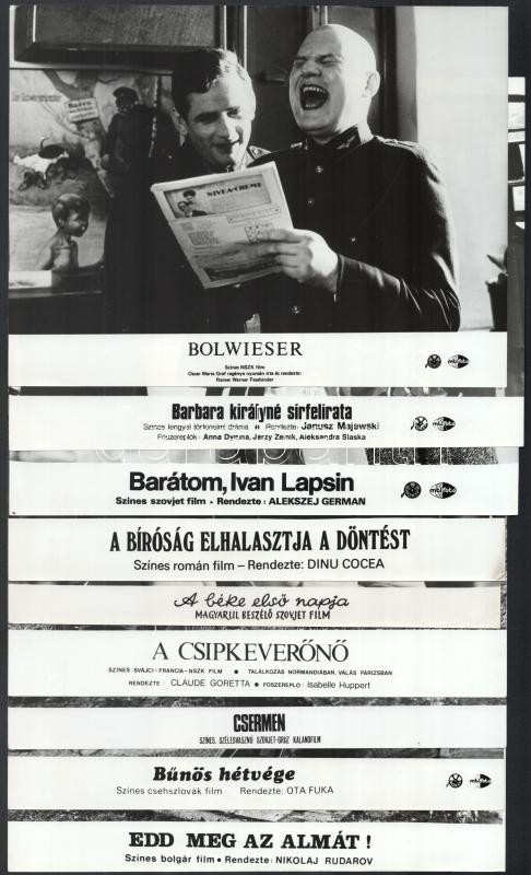 cca 1989 előtt készült filmek egy-egy jelenet fotója, 33 db vintage produkciós filmfotó (vitrinfotó, lobbyfotó) ezüst zselatinos fotópapíron, a használatból eredő (esetleges) kisebb hibákkal, 18x24 cm