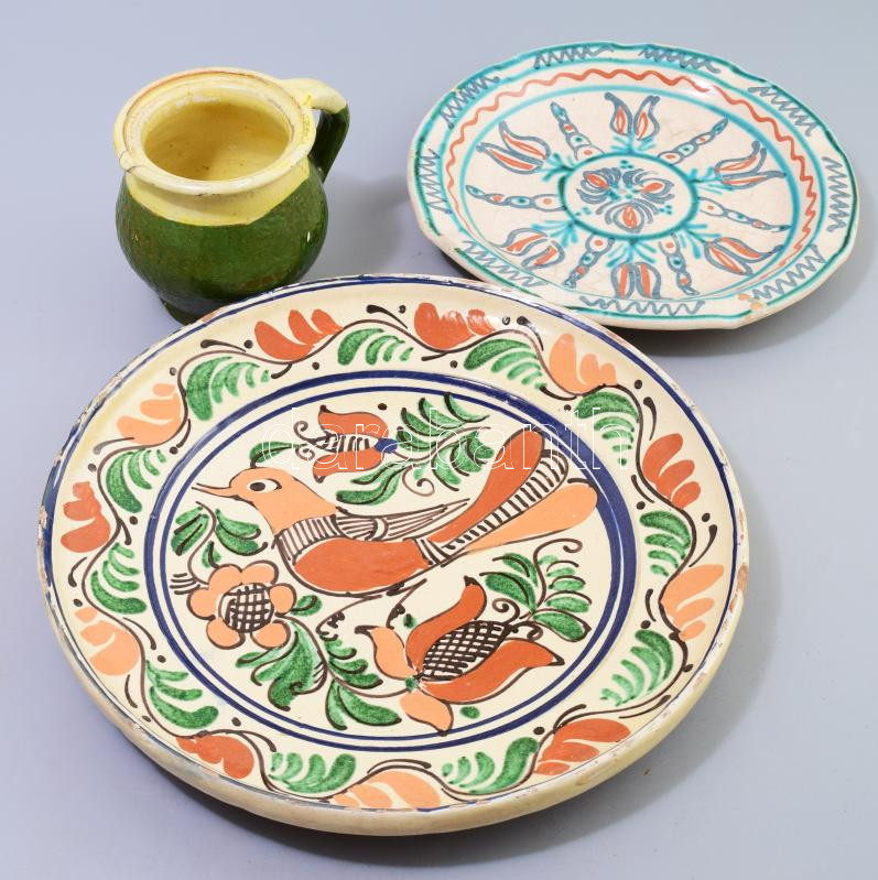 3 db régi mázas cserép disztál és kancsó. Kézzel festett, XIX. sz. apróbb sérülésekkel d: 30 cm-ig