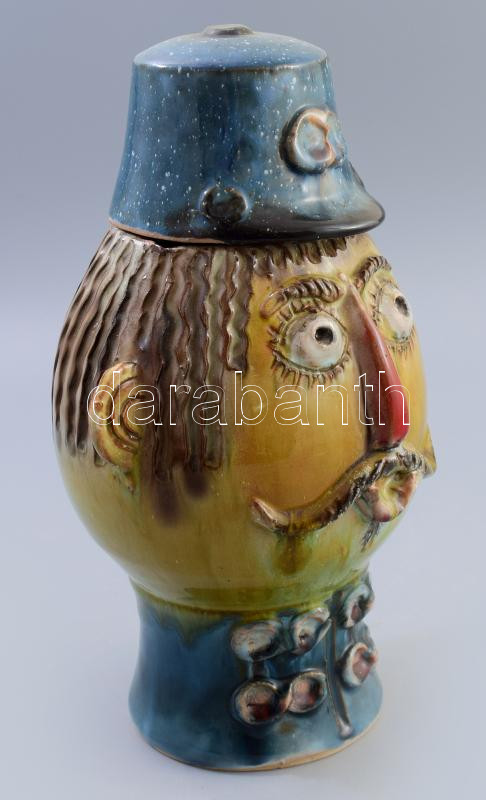 Császári katonafejes mázas kerámia edény, váza, kézzel festett, jelzés nélkül, hibátlan 28 cm