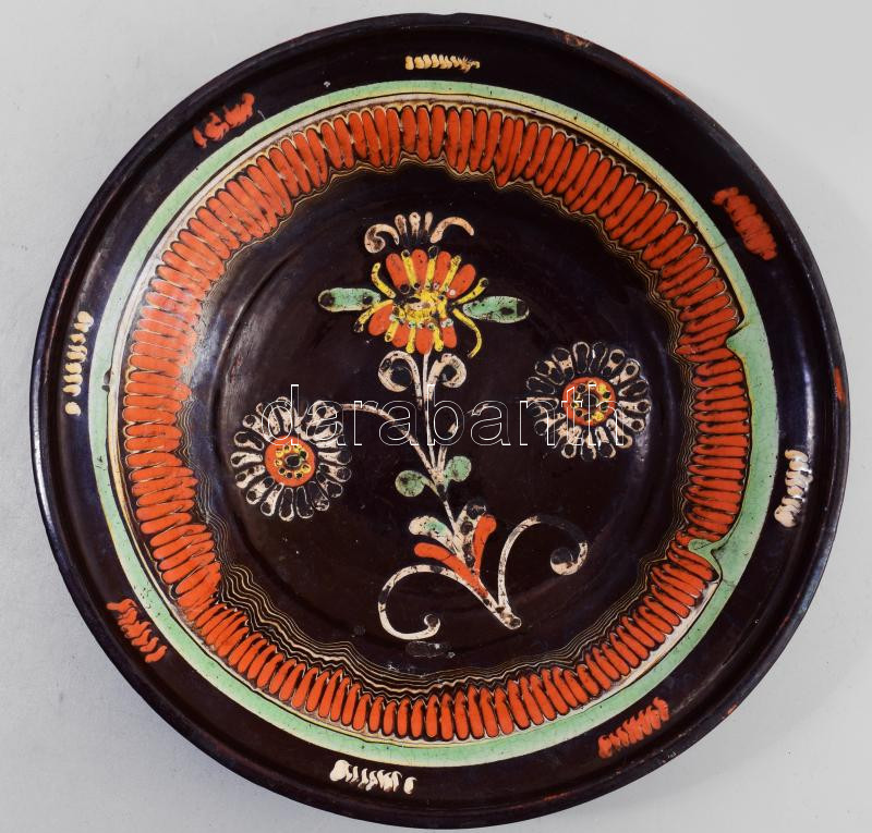 Lakoldalmas tányér. Mázas cserép XIX. sz. kézzel festett, hibátlan d: ...