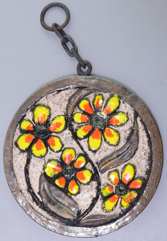 Retro német mázas kerámia falidísz, kovácsolt akasztóval, d: 18 cm