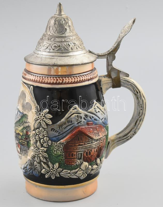 Original King hegyi faház jelenetes söröskorsó, ón fedéllel, jelzéssel, hibátlan, m: 18 cm