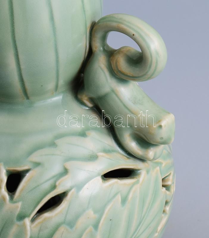 Szeladon mázas duplafalú váza, tölgylevél és makk díszítéssel, mókusfigura fülekkel, jelzés nélkül, hibátlan, m: 34,5 cm