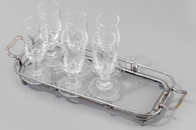 Likőrös készlet. 6 db csiszolt üveg pohár, art deco fém tálcával 26x9 ...