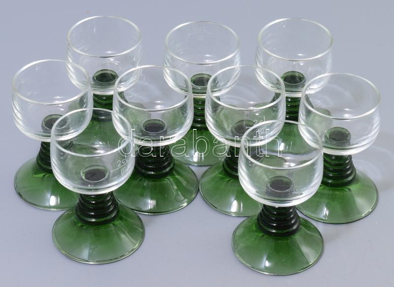 Régi színezett talpas snapszos pohár garnitúra, 9 darab, jelzett, m: 8...
