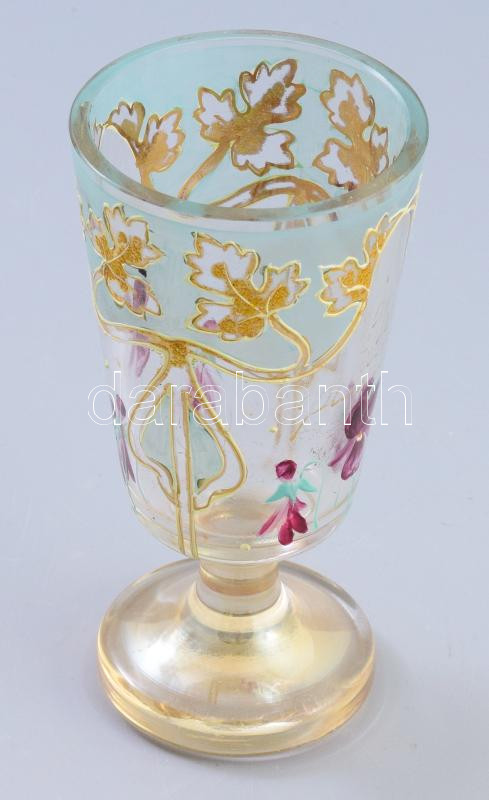 cca 1900, Cseh emlékpohár, zománcfestett díszítéssel, kopással, m: 15 ...