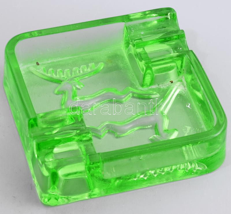 cca 1920/30 Uránzöld színű üveg hamuzó, ugró szarvas mintával, pattogzással, 12x12 cm