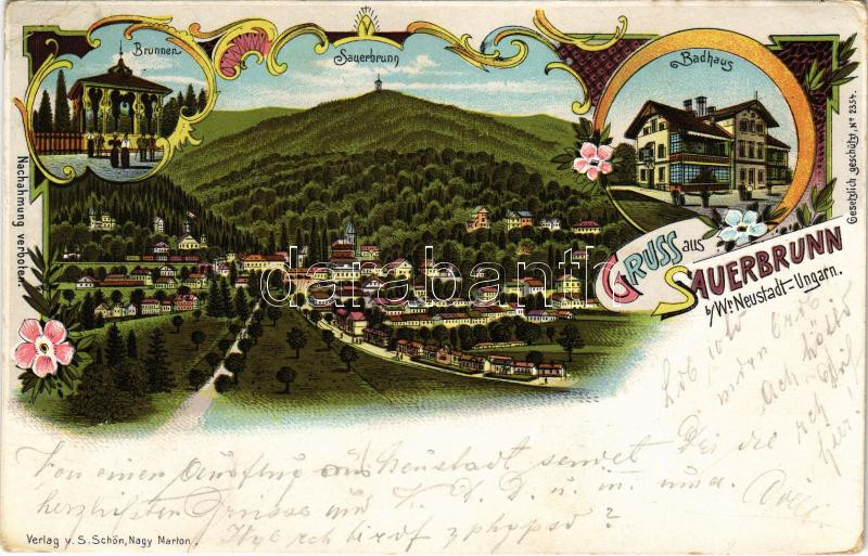 1902 Savanyúkút, Bad Sauerbrunn bei Wiener Neustadt; Brunnen, Sauerbrunn, Badhaus / forrás kút, látkép, fürdőház. S. Schön kiadása / spa, spring source, general view, bathhouse. Art Nouveau, floral, litho (EK)