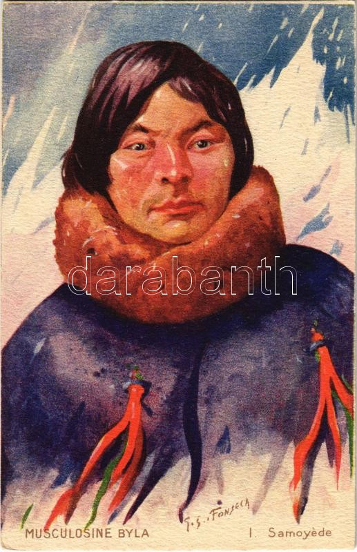 Samoyed man, folklore, art postcard s: Fonseca + Musculosine Byla advertisement (non PC)