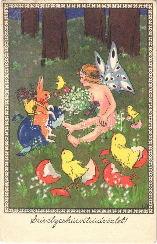 Szívélyes húsvéti üdvözlet! / Easter greeting art postcard, rabbit with fairy and chicken. PG. W.I. 507-2. s: HMS (EB)