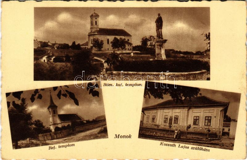 https://www.darabanth.com/en/475-Online-auction/475.0/Postcards/Hungary~1500005/1943-Monok-Romai-katolikus-templom-Reformatus-templom-Kossuth-Lajos-szulohaza-Hangya-szove~II3204713