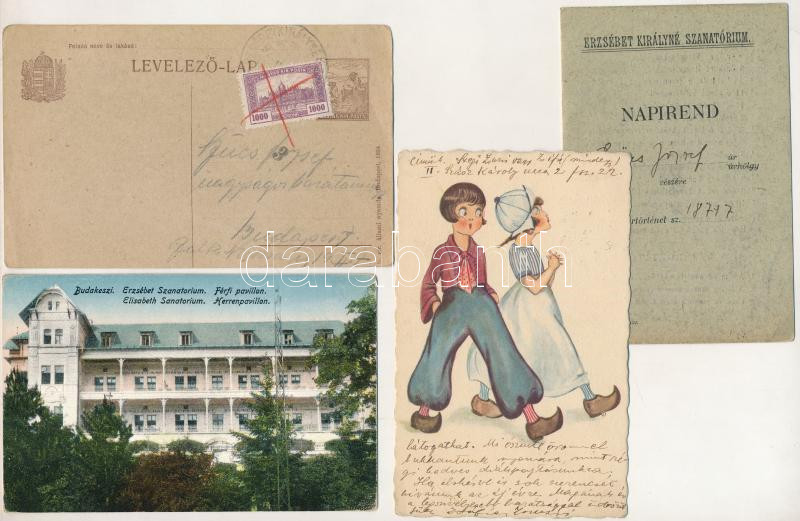 Budakeszi, Erzsébet szanatórium - férfi pavilon képeslap, 2 Szűcs Józsefnek a szanatóriumba címzett levél + 1 Napirend