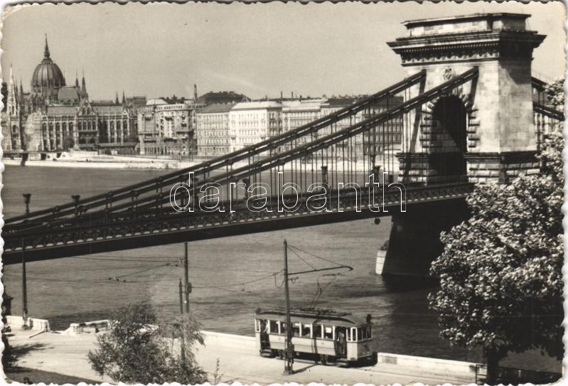 Budapest, Lánchíd, villamos. Képzőművészeti Alap Kiadóvállalat. Czeizing Lajos felvétele (EK)