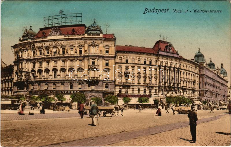 Budapest VI. Váci út, villamos, Krayer E. és Társa üzlete, Vígszínház kávéház, sörcsarnok, Magyar Leszámítoló és Pénzváltó Bank