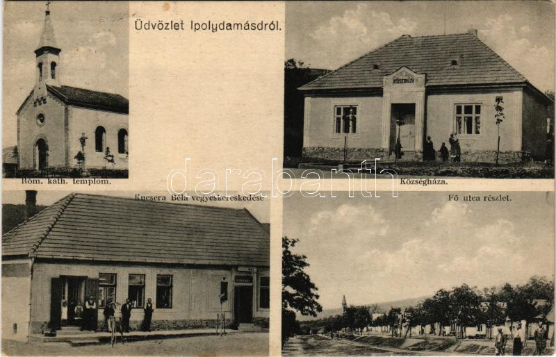 Ipolydamásd, Római katolikus templom, községháza, Fő utca, Kucsera Béla üzlete (fl)