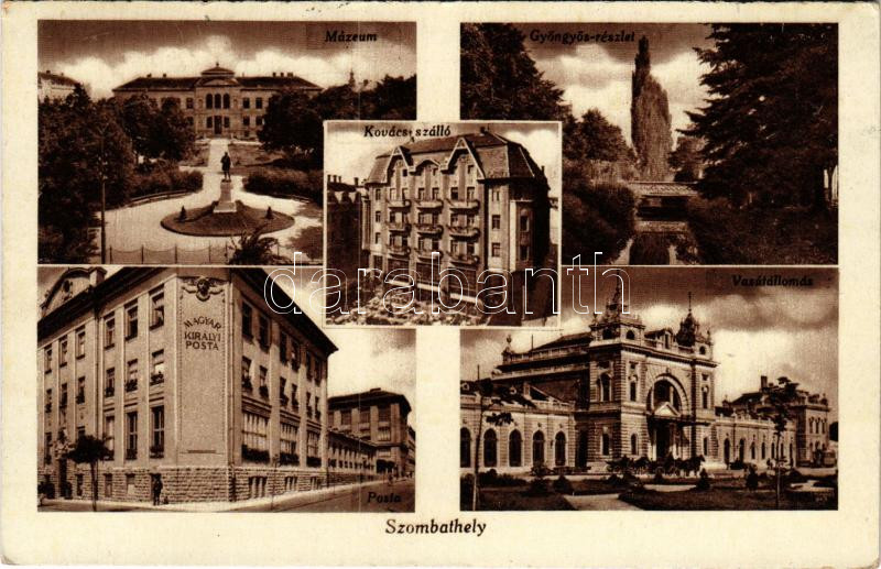 Szombathely, Múzeum, posta, Kovács szálló, Gyöngyös részlet, vasútállo...