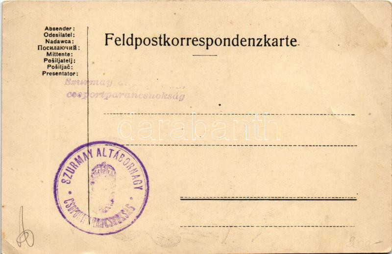 1916 Tábori Postai Levelezőlap / Friede. Feldpostkarte / WWI German and Austro-Hungarian K.u.K. military field postcard + "Szurmay altábornagy csoportparancsnokság" (EB)