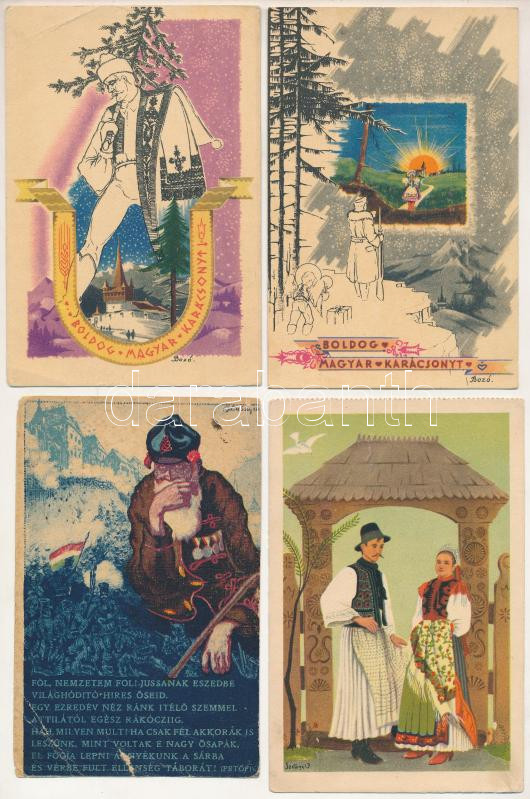 10 db régi magyaros motívum képeslap: irredenta, folklór, üdvözlőlapok (Bozó Gyula) / 10 pre-1945 Hungarian motive postcards: irredenta propaganda, folklore, greeting cards