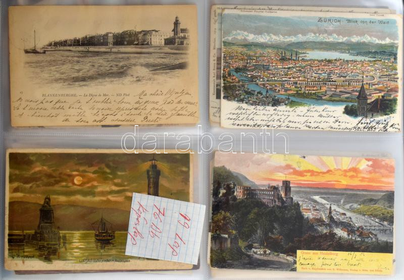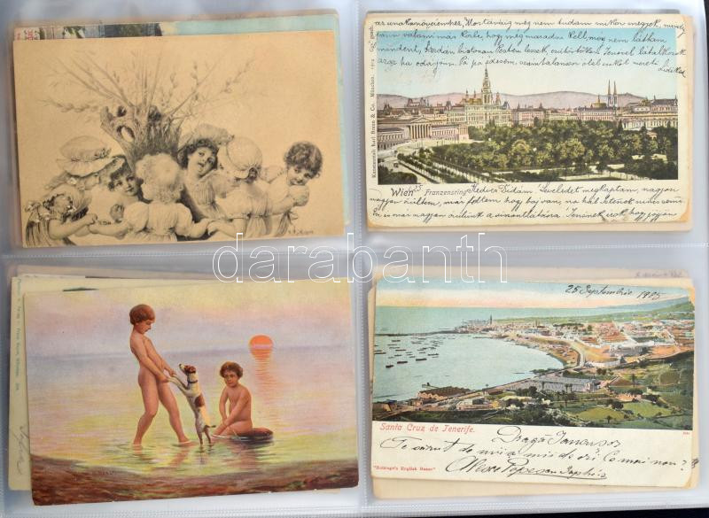 Description: 76 db régi képeslap 19 lapos gyűrűs albumban, főleg külföldi és magyar város képeslapok, motívumlapok / 76 pre-1945 postcards in a postcard album, mainly European and Hungarian town-view postcards, motive cards