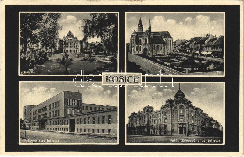 1938 Kassa, Kosice; Divadlo, Dóm, Postové riaditelstvo, Palác Zemského velitelstva / Színház, Székesegyház, Postaigazgatóság, tartományi székház / theatre, county hall, cathedral, post directorate, palace of the provincial headquarters + "1938 Kassa visszatért" So. Stpl.