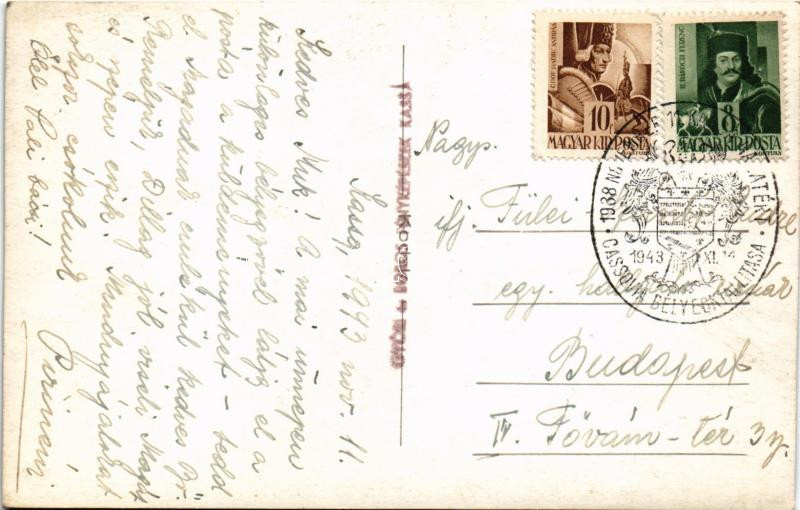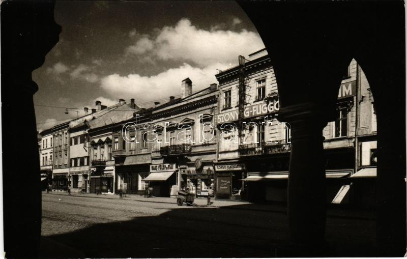 1943 Kassa, Kosice; utca, Corso illatszertár, drogéria, Kassai Takarékegylet M. Sz., MÁV hivatalos jegyiroda, Markovics szőnyeg-függöny, Gombos üzlete / street view, drugstore, savings bank, Hungarian State Railways ticket office, shops. Győri és Boros photo + "1938. november 11. KASSA HAZATÉRT - Cassovia Bélyegkiállítása 1943. XI. 14." So. Stpl.