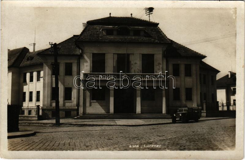 Losonc, Lucenec; Okresny úrad / Járási hivatal, automobil / district office, automobile + "1938 Losonc visszatért" So. Stpl. (EK)