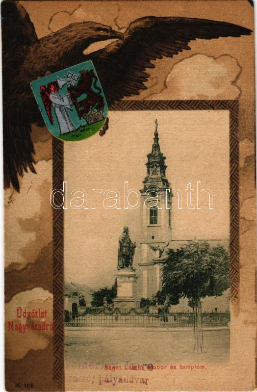 Description: 1902 Nagyvárad, Oradea; Szent László szobor és templom. Ifj. Berger Sámuel kiadása. Szecessziós címeres litho keret / monument, church. Art Nouveau, litho frame with coat of arms (EK)