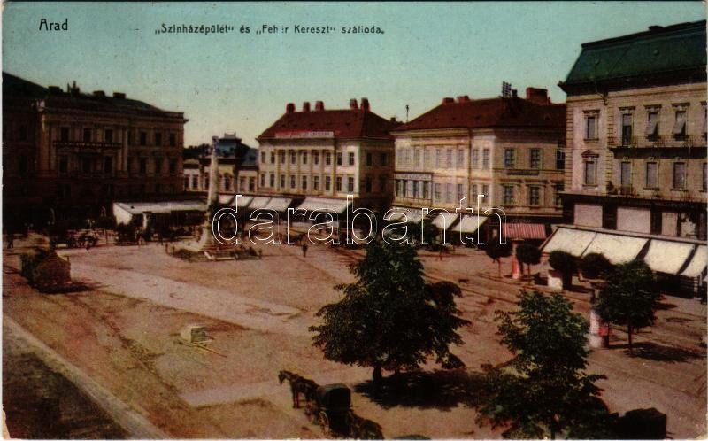 1911 Arad, Színház, Fehér Kereszt szálloda, üzletek, autóbusz, lovaskocsi, városi vasút, vonat / theatre, hotel, shops, autobus, horse-drawn carriage, urban railway, train