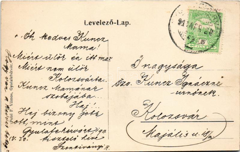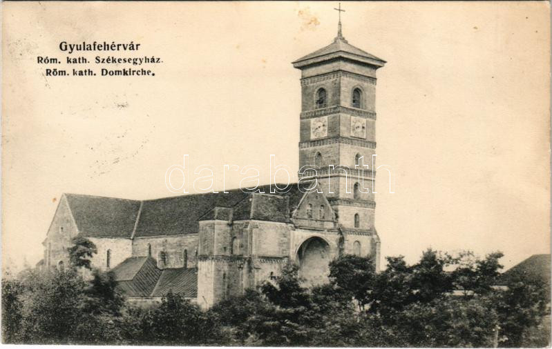 1911 Gyulafehérvár, Alba Iulia; Római katolikus székesegyház. Petri F. Vilmos kiadása. Hátoldalon Szentiványi Róbert (1880-1961) magyar római katolikus pap, egyházi író, könyvtáros, egyetemi tanár - 1907-1919 között a gyulafehérvári hittudományi főiskola tanára, a Batthyaneum könyvtár őre, majd igazgatója - verses levele / Röm. kath. Domkirche / cathedral. Letter of Róbert Szentiványi, Hungarian Catholic priest, ecclesiastical writer, librarian, university teacher - between 1907-1919 a teacher at the College of Religious Studies in Alba Iulia, keeper and then director of the Batthyaneum library - on the backside