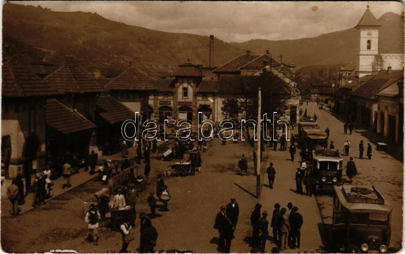 1930 Petrozsény, Petrosani; Piata / Piactér, autóbuszok, üzletek. J. J...
