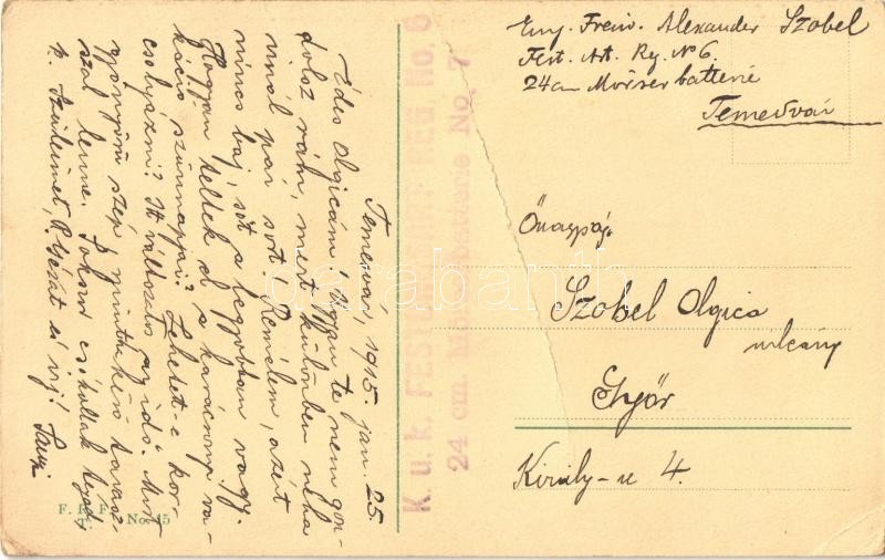 Temesvár, Timisoara; Piarista főgimnázium / grammar school + "K.u.K. Festungsart. Rg. No. 6. 24 cm. Mörserbatterie No. 7." (fa)