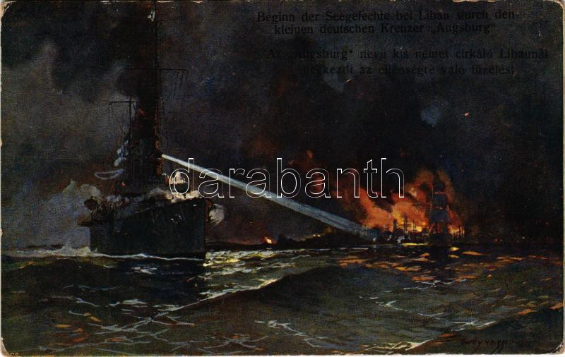 Description: Beginn der Seegefechte bei Libau durch den kleinen deutschen Kreuzer "Augsburg" / Az "Augsburg" nevű kis német cirkáló Libaunál megkezdi az ellenségre való tüzelést / WWI Imperial German Navy (Kaiserliche Marine) art postcard, SMS Augsburg light cruiser begins firing at Liepaja (Latvia) s: Harry Heusser (EK)