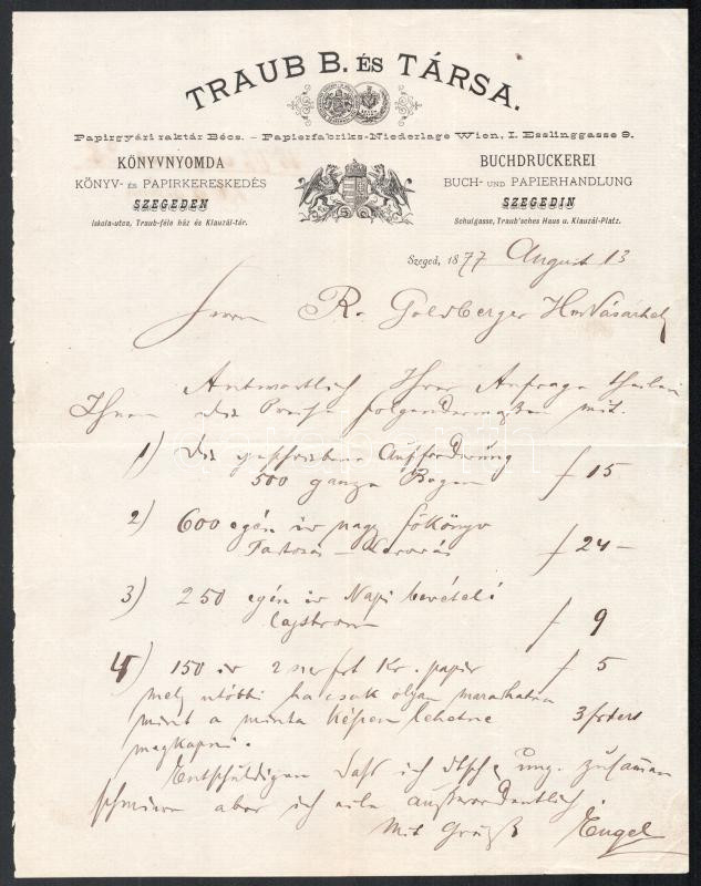 1877 Szeged, Traub B. és Társa könyvnyomda, könyv. és papírkereskedés számlája, díszes fejléces, címeres papíron, hajtásnyommal, jó állapotban