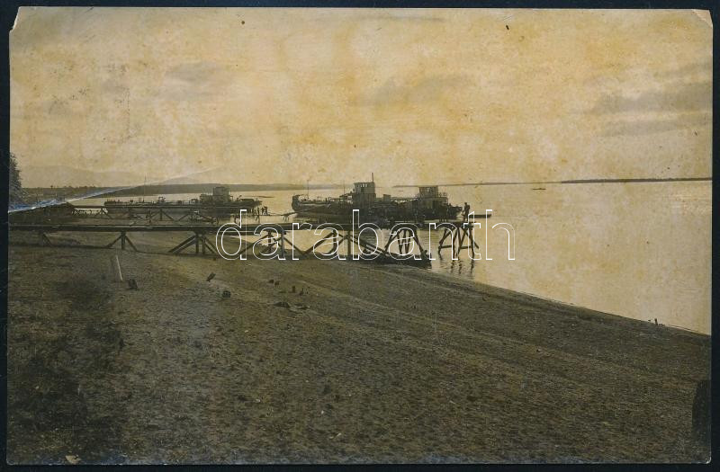 1919 A Krasznaja Recska, Rjecska, Krasnaia- Rjetschka (Vladivostok) hadifogoly tárborb melleti kikötő Stobbe Kálmán (1883-1936) építőmester, díszlettervező, labdarúgó, a magyar válogatott edzője pecséttel jelzett fotója, feliratozott, kissé sérült / Port of Krasnaia- Rjetschka (Vladivostok) Japanese-Russian POW (prisoner of war) camp. photo with some damage 15x9,5 cm