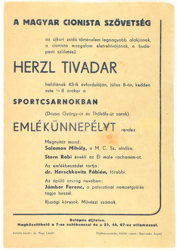 1947 A Magyar Cionista Szövetség meghívója Herzl Tivadar halálának 43....