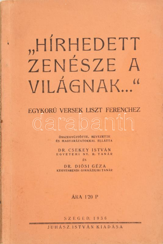 Description: Dr. Csekey - Dr. Diósi: "Hírhedett zenésze a világnak..." Egykorú versek Liszt Ferenchez. Dr. Diósi Géza által DEDIKÁLT! Szeged, 1936, Juhász István. Kiadói papírkötés, kopottas állapotban.