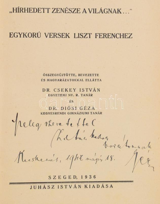 Dr. Csekey - Dr. Diósi: "Hírhedett zenésze a világnak..." Egykorú vers... https://www.darabanth.com/en/476-Online-auction/476.0/Art-and-other-collectibles/Advertisement~2000116/Dr-Csekey-Dr-Diosi-Hirhedett-zenesze-a-vilagnak-Egykoru-versek-Liszt-Ferenchez-Dr~II3240729
