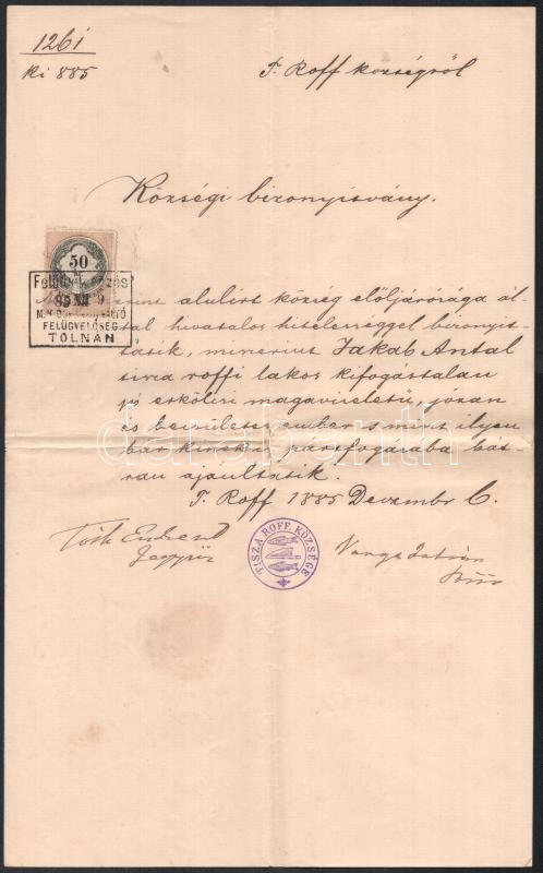 1885 Tiszaroff, községi bizonyítvány pecséttel, okmánybélyeggel