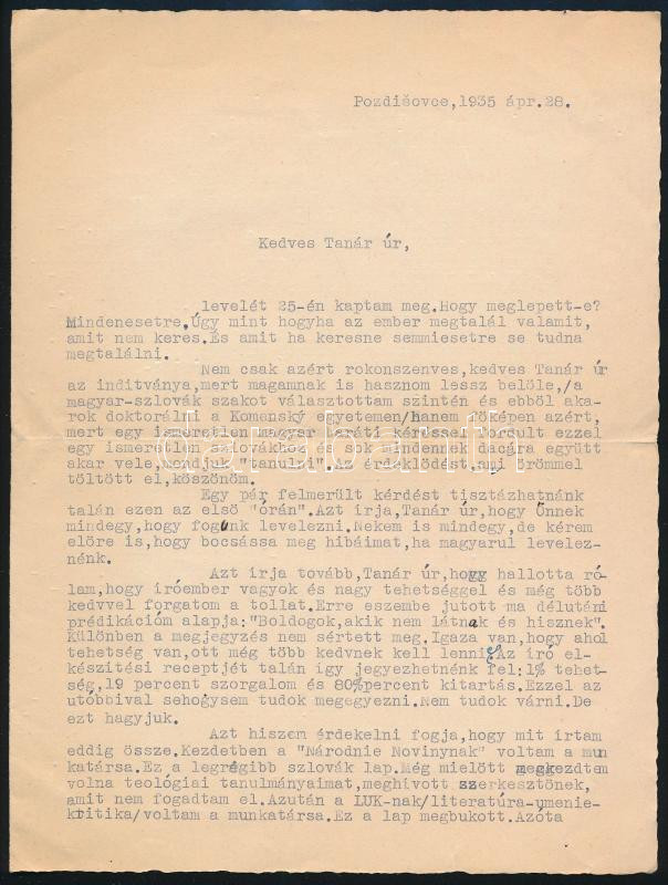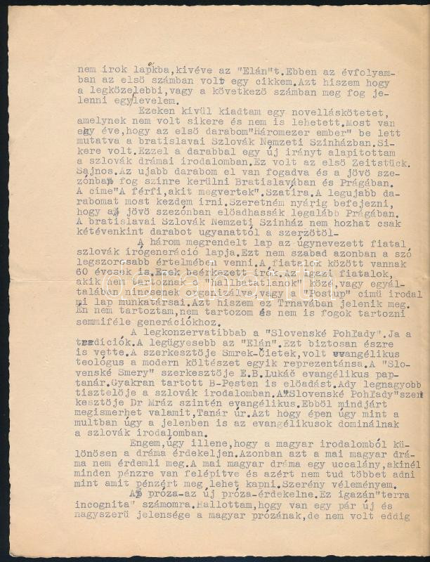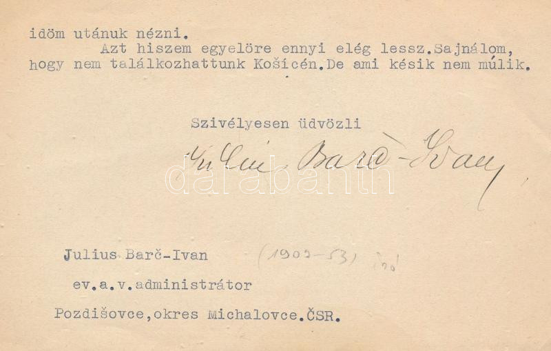 1935 Julus Barc-Ivan szlovák író magyar nyelvű, gépelt, aláírt levele