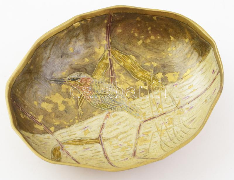 Zománcozott bronz madaras kínáló, kopott, 17x15 cm